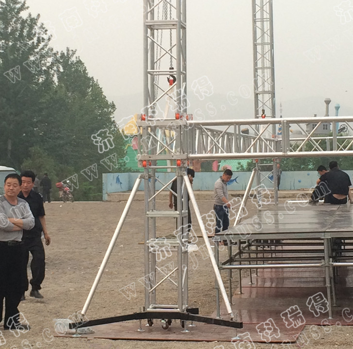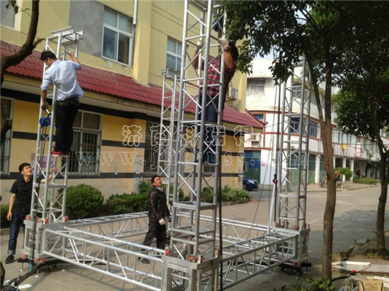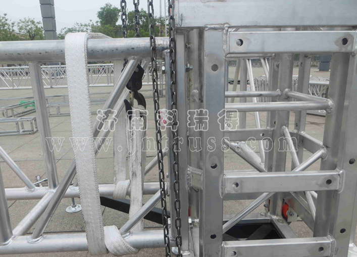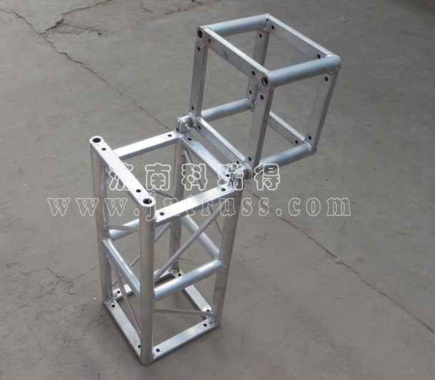 做演出節(jié)目搭建升降鋁合金桁架,可以選用中型,大型規(guī)格桁架。比如:300*300  400*400  450*450  400*600 500*500 500*600  520*760 760*910 等規(guī)格。 最常搭建造型為四根橫梁四根立柱升降燈光桁架。通常由:方套,反頭,橫擔(dān),底座,斜撐,吊帶,吊葫蘆等7七種配件組成。見(jiàn)下圖: